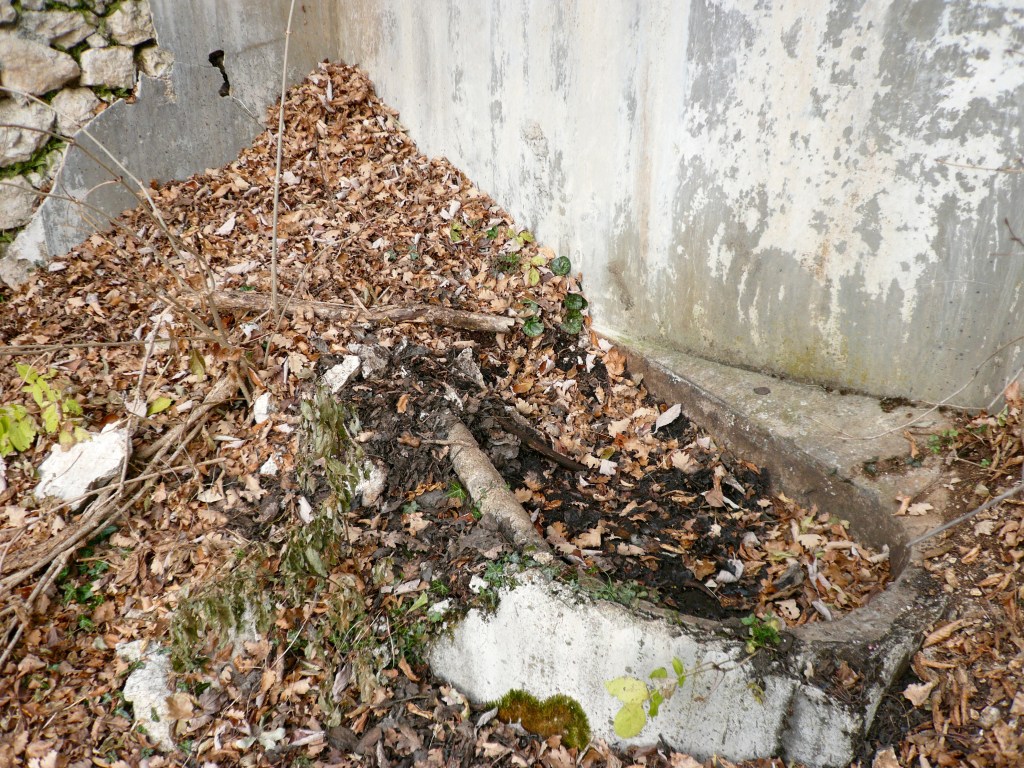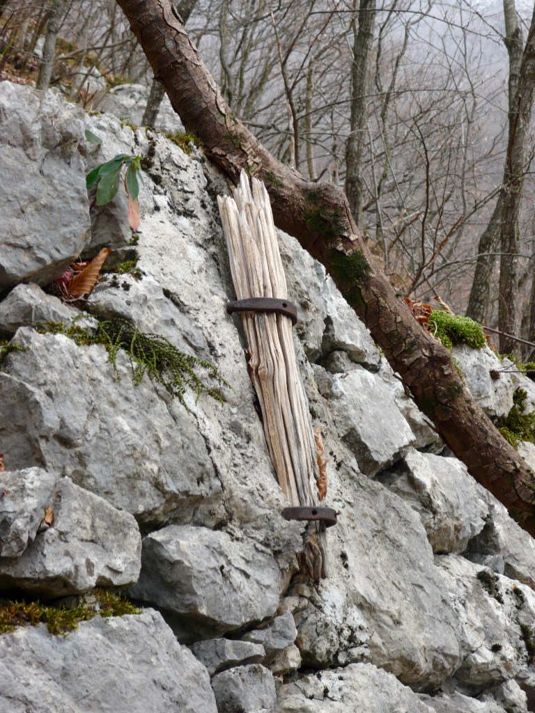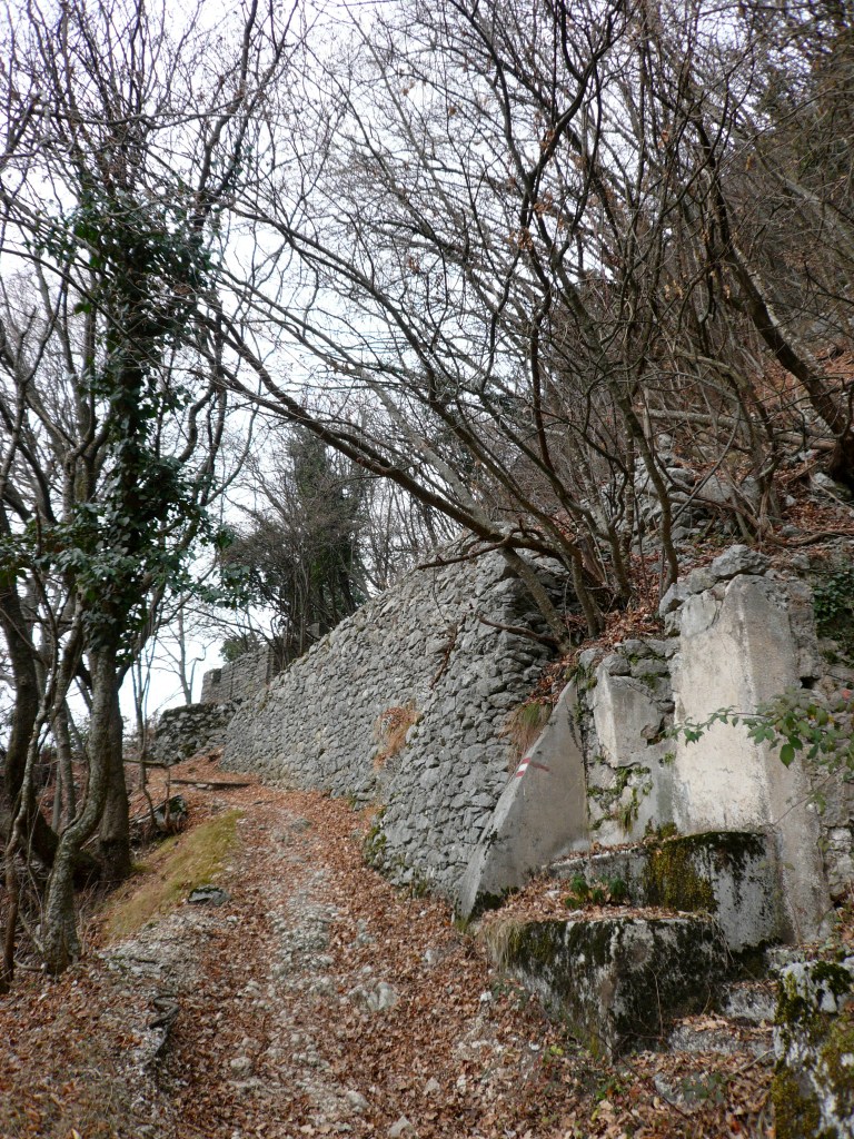 A sx resti delle estese strutturazioni a secco dei terrazzi e dei muri di contenimento per le baracche dell’ospedaletto. A dx un dettaglio del parapetto in legno.