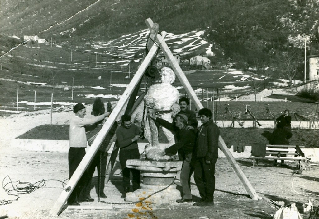 La posa della scultura a San Michele nell’inverno del 1967. Nella foto anche Ben Ben e Guarnati Arnaldo, reduce di Russia.