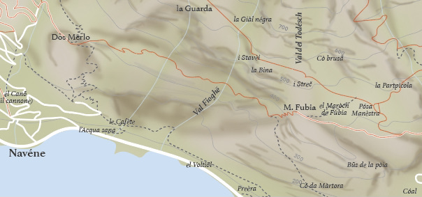 Interessante è anche l’aspetto legato alle vecchie vie di comunicazione (antecedenti le più recenti strada Gardesana e strada Panoramica) che risaltano in maniera netta e chiara nella carta storica per la ricchezza di toponimi lungo il loro tragitto. Come ad esempio il sentiero per la Guarda, a mezza costa tra Campagnola e Navene, che oggi è quasi sconosciuto ai più.