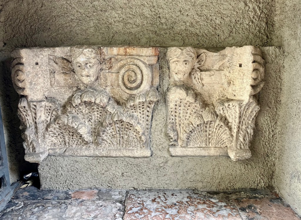 ” Nel 1976 l’arciprete di Malcesine Don Nicola Azzali vuole usufruire del terreno – parte scosceso, parte pianeggiante – a ridosso della canonica per costruirvi un campo da pallavolo. Vengono in luce quattro mezzi capitelli (uno mutilo) scolpiti per essere corporazione di mezzi pilastri. Pietra serena. “